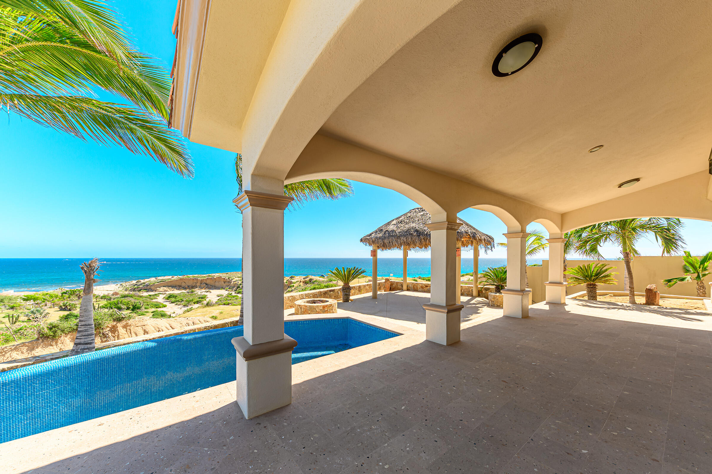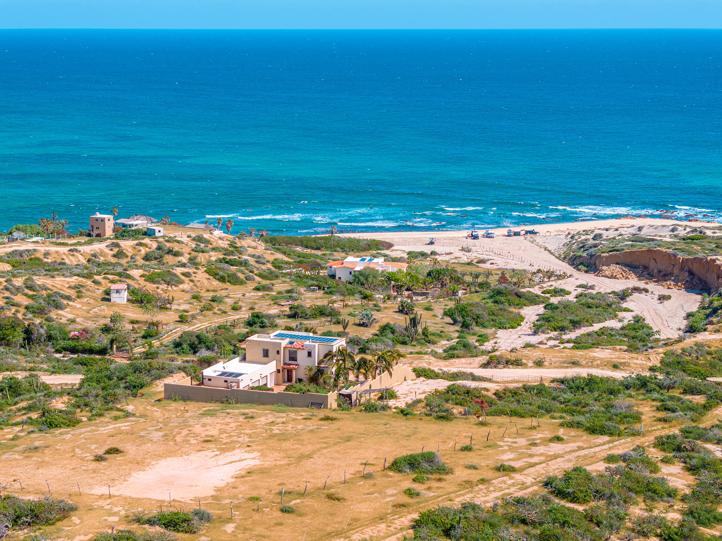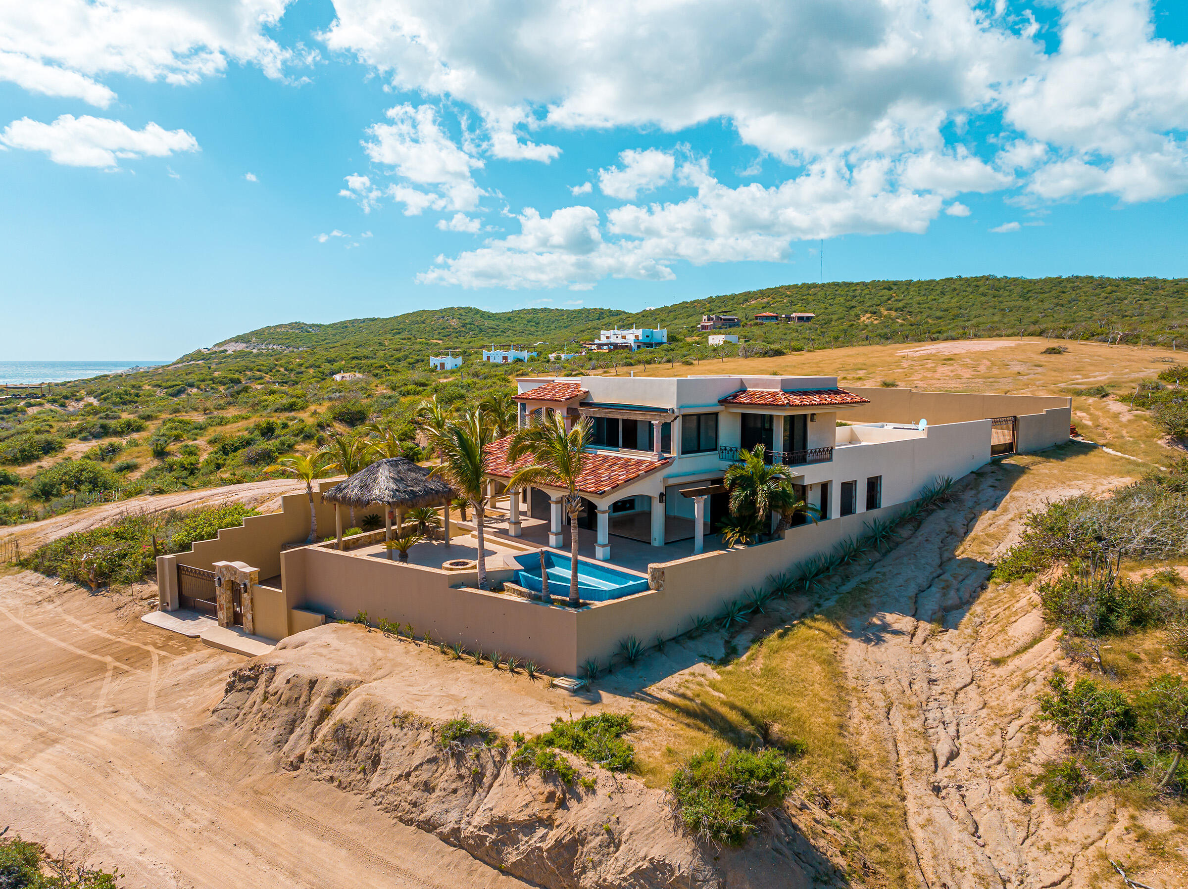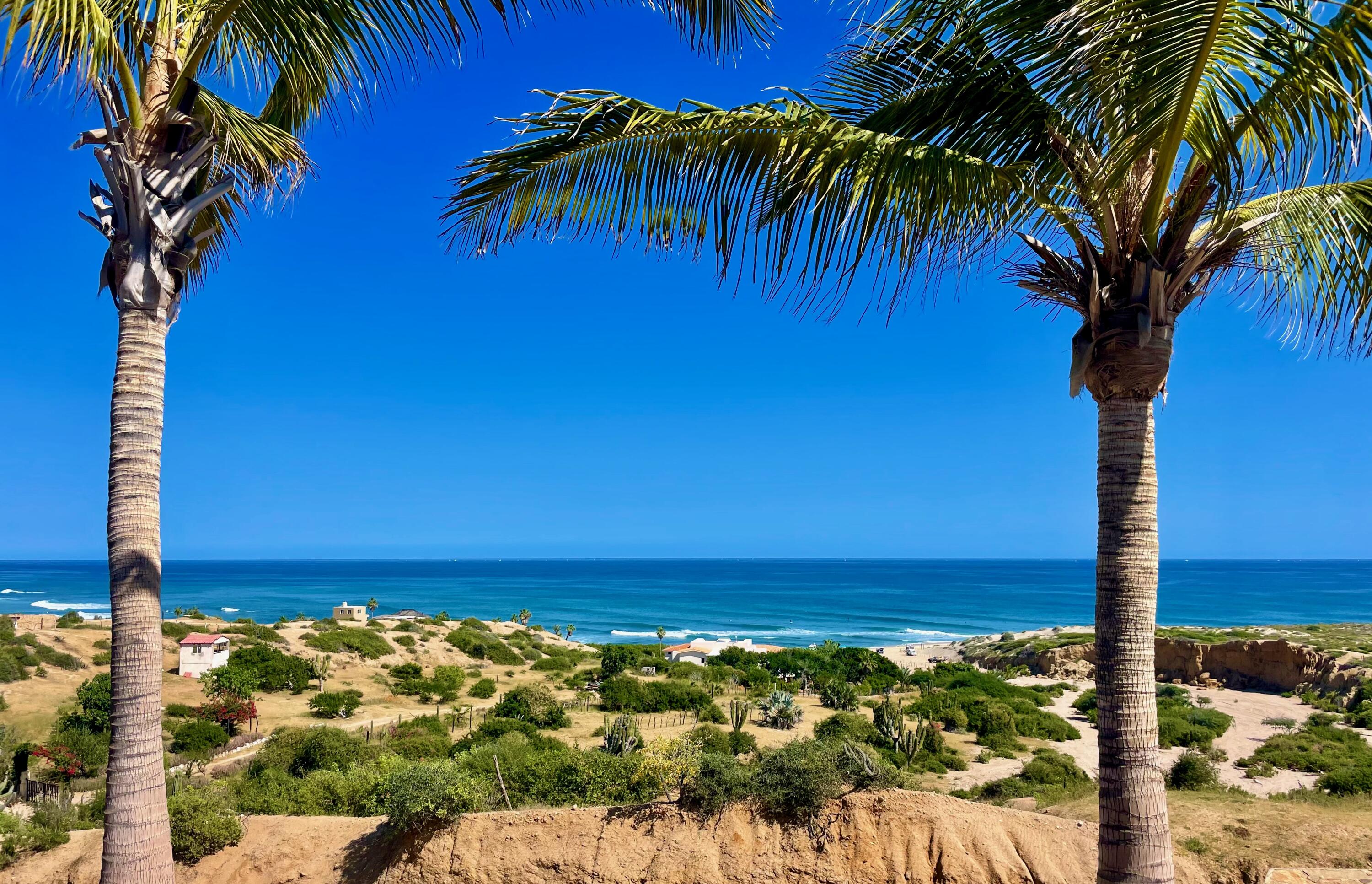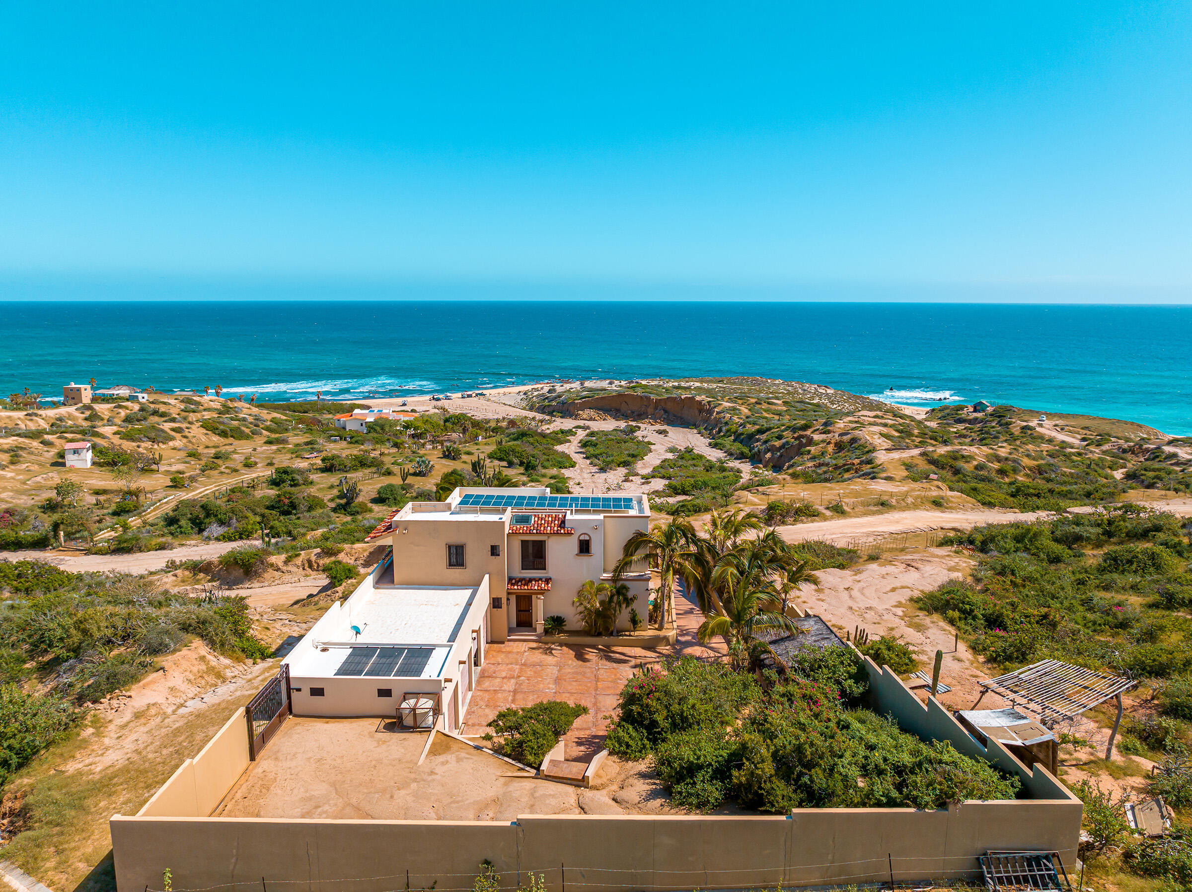 From its position on the hillside Nine Palms Surf Villa offers unparallelled views of Nine Palms Surf Break. This luxury four-bedroom, four and a half bath home sitting at the center of one of the most incredible surf destinations in the world, the southern East Cape, would be a successful vacation rental or a private retreat for surfers, nature and ocean lovers. The house occupies half of the half-acre lot, providing ample space for the construction of an additional home or guest quarters or to subdivide and sell. The approximately 2,600 square-foot home was built to embrace surf views from all four bedrooms and the pool /patio area. It has never been occupied. A four-car garage houses the solar, battery and water systems with loads of room for vehicles and ocean toys. In addition to the surf, you can also watch humpback whales breaching, dolphins playing in the surf, and huge schools of morbula rays popping like popcorn across the sea's surface.