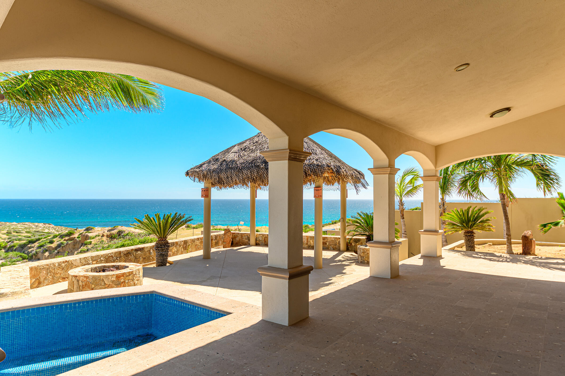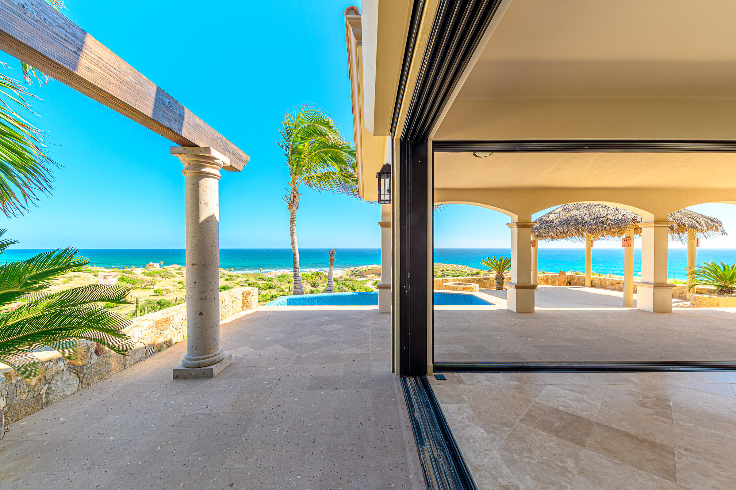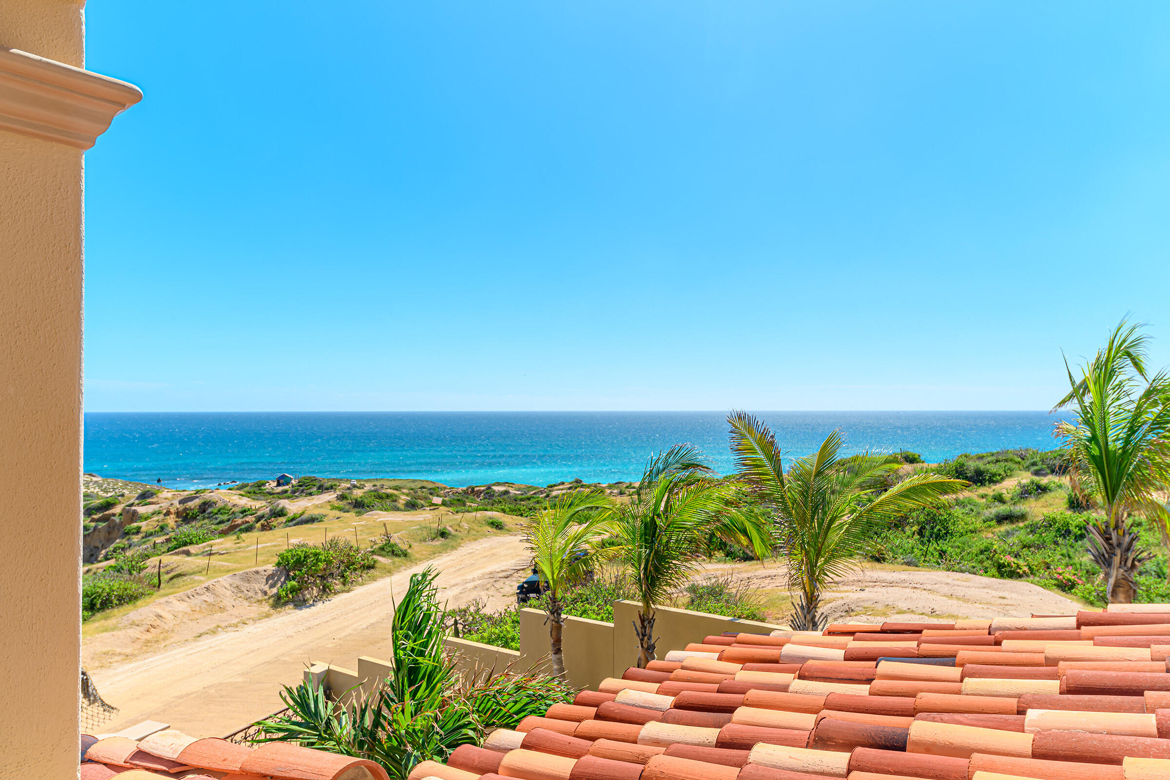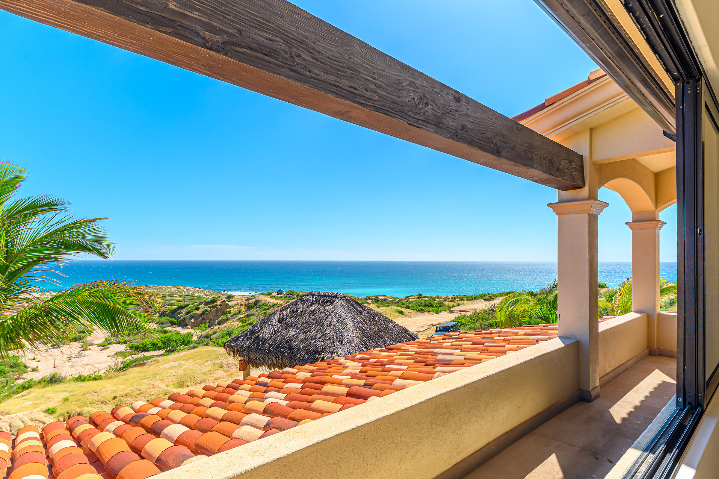 From its position on the hillside Nine Palms Surf Villa offers unparallelled views of Nine Palms Surf Break. This luxury four-bedroom, four and a half bath home sitting at the center of one of the most incredible surf destinations in the world, the southern East Cape, would be a successful vacation rental or a private retreat for surfers, nature and ocean lovers. The house occupies half of the half-acre lot, providing ample space for the construction of an additional home or guest quarters or to subdivide and sell. The approximately 2,600 square-foot home was built to embrace surf views from all four bedrooms and the pool /patio area. It has never been occupied. A four-car garage houses the solar, battery and water systems with loads of room for vehicles and ocean toys. In addition to the surf, you can also watch humpback whales breaching, dolphins playing in the surf, and huge schools of morbula rays popping like popcorn across the sea's surface.