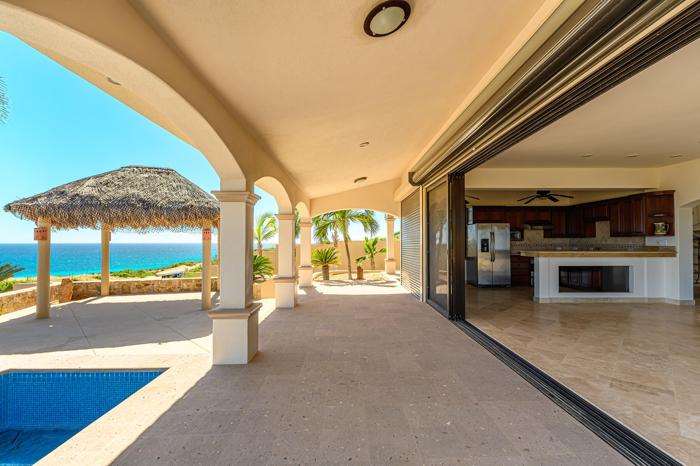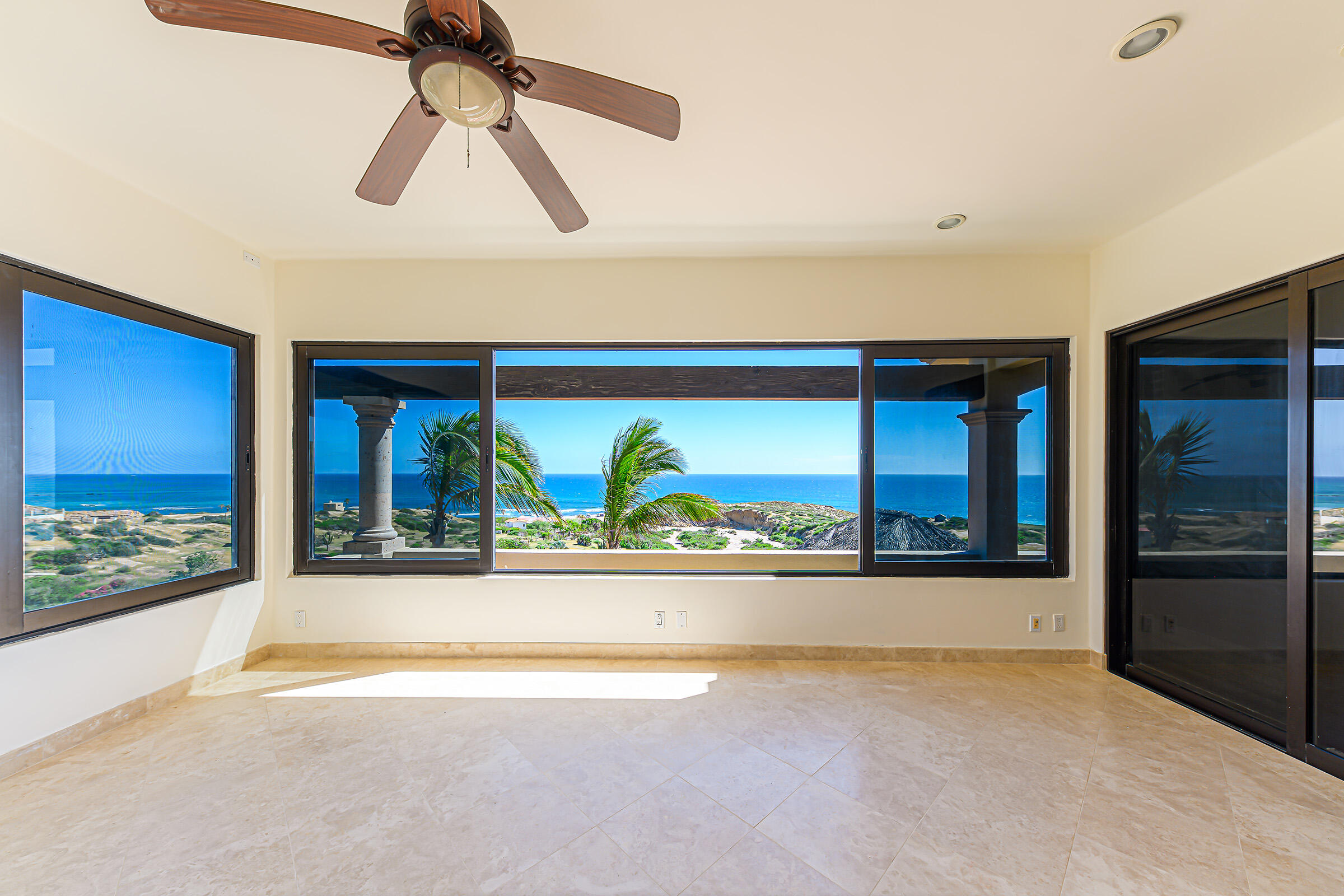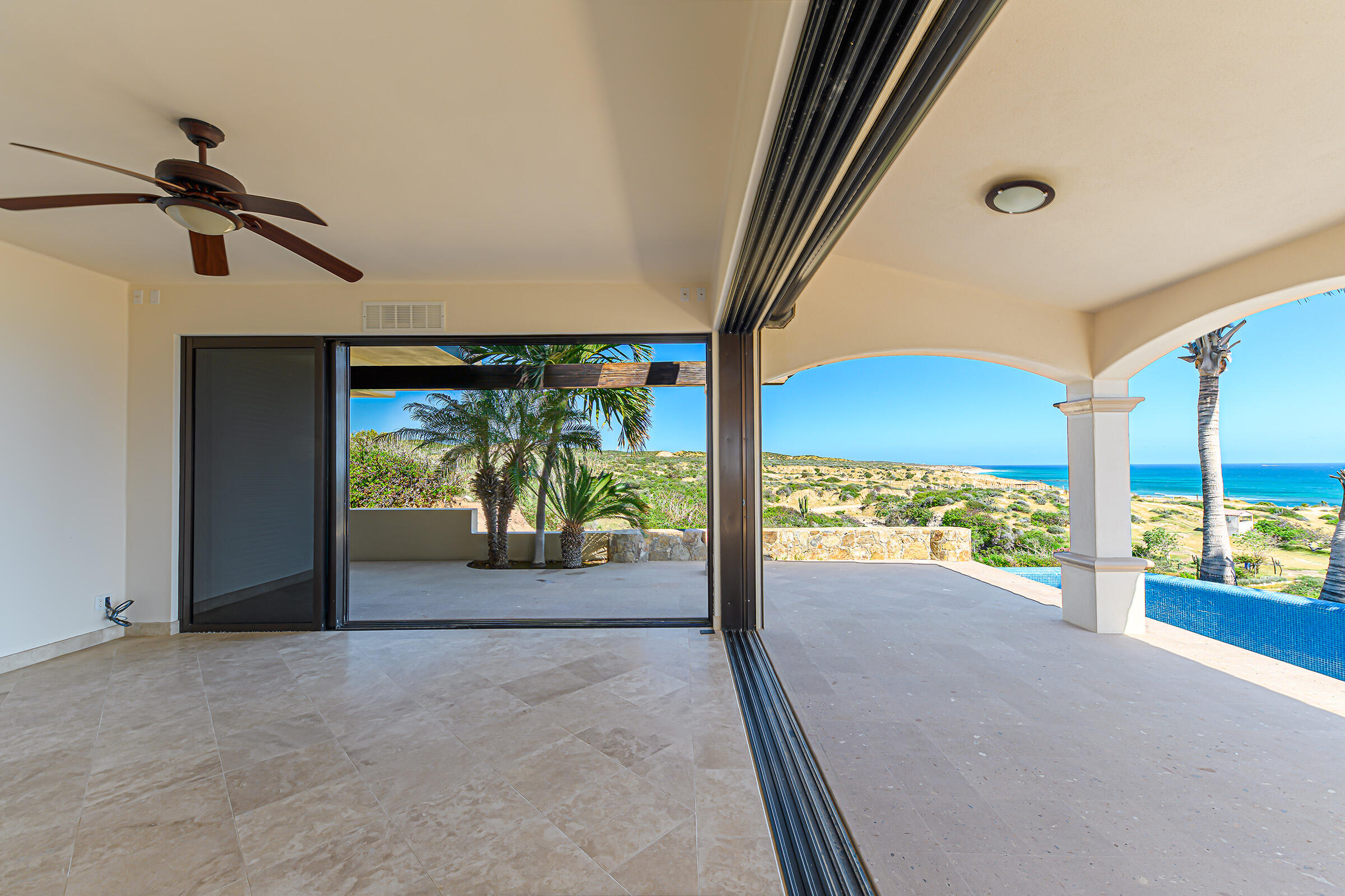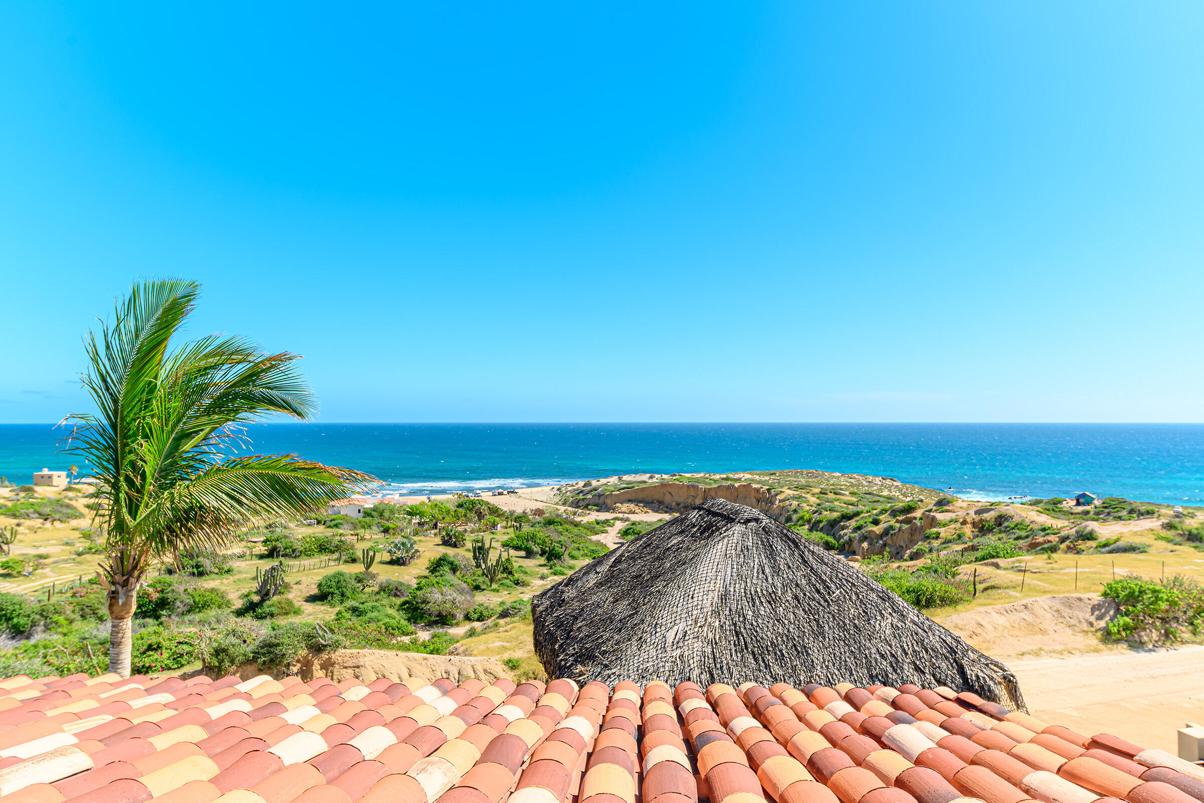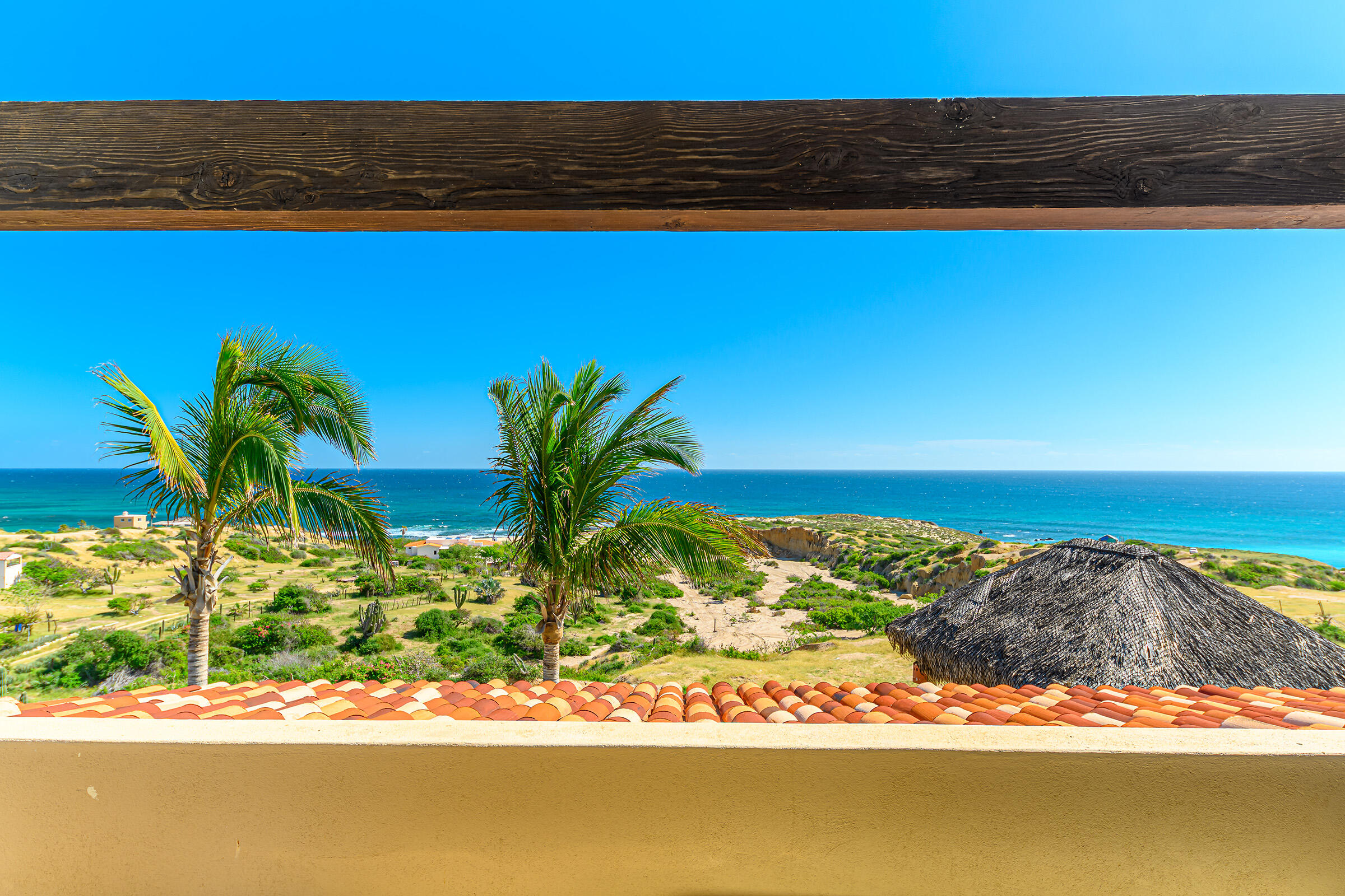 From its position on the hillside Nine Palms Surf Villa offers unparallelled views of Nine Palms Surf Break. This luxury four-bedroom, four and a half bath home sitting at the center of one of the most incredible surf destinations in the world, the southern East Cape, would be a successful vacation rental or a private retreat for surfers, nature and ocean lovers. The house occupies half of the half-acre lot, providing ample space for the construction of an additional home or guest quarters or to subdivide and sell. The approximately 2,600 square-foot home was built to embrace surf views from all four bedrooms and the pool /patio area. It has never been occupied. A four-car garage houses the solar, battery and water systems with loads of room for vehicles and ocean toys. In addition to the surf, you can also watch humpback whales breaching, dolphins playing in the surf, and huge schools of morbula rays popping like popcorn across the sea's surface.